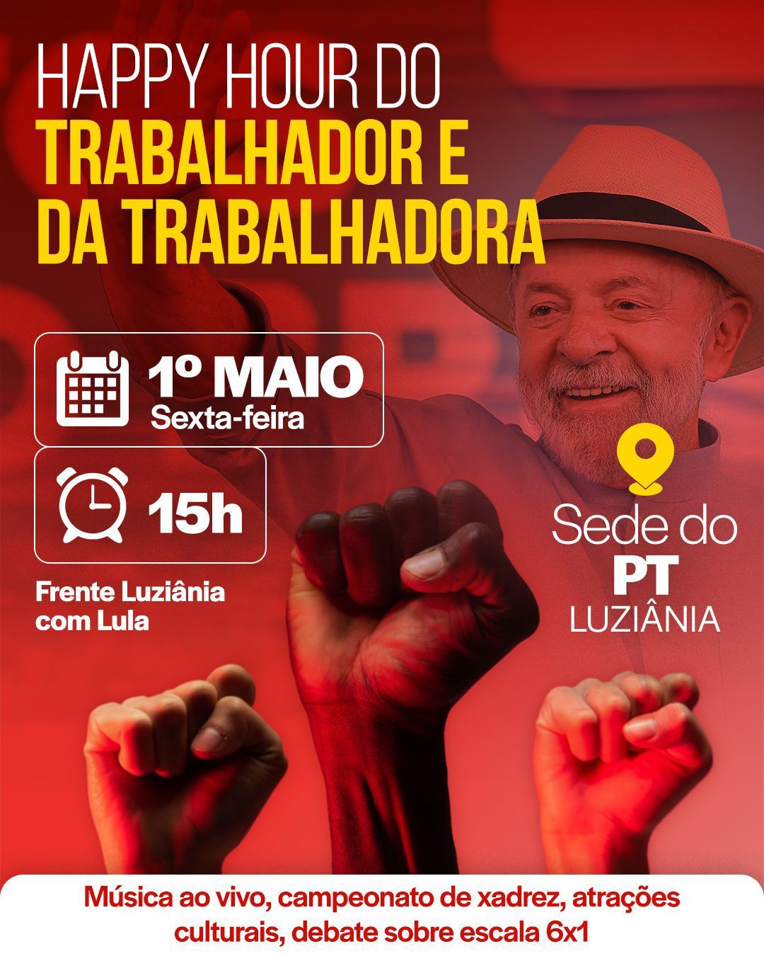 A Dia do Trabalhador será celebrado em Luziânia com uma programação que mistura cultura, lazer e discussão política. Organizado pela Frente Luziânia com Lula, o evento “Happy Hour do Trabalhador e da Trabalhadora” está marcado para sexta-feira (1º), a partir das 15h, na sede do Partido dos Trabalhadores (PT) no município.