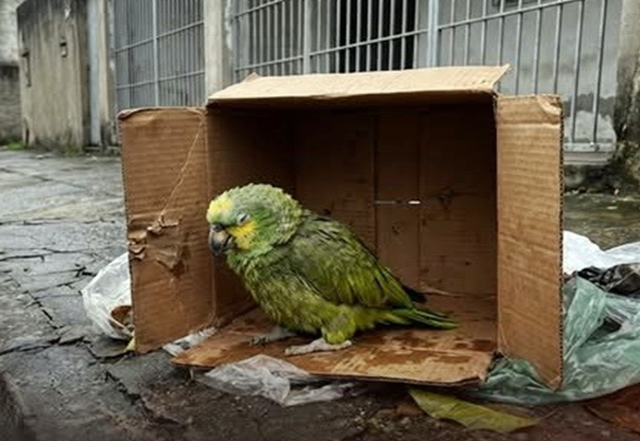 Papagaio abandonado no lixo após morte da tutora é resgatado por gari e ganha novo lar
