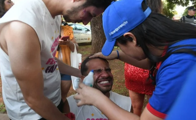 A imprensa flagrou o momento em que o deputado distrital Fábio Félix foi atingido por um jato de spray de pimenta no rosto durante uma ação da Polícia Militar do Distrito Federal, na tarde desta segunda-feira (16/2), no Bloco Rebu, no Distrito Federal.